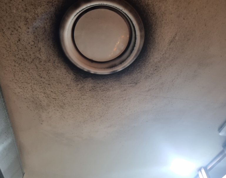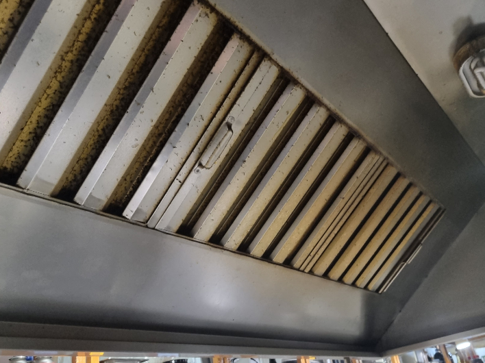 천장을 살펴보니, 환풍기 주변에 기름을 먹은 먼지가 쌓여 있었고, 이 먼지는 제거하기가 쉽지 않았습니다